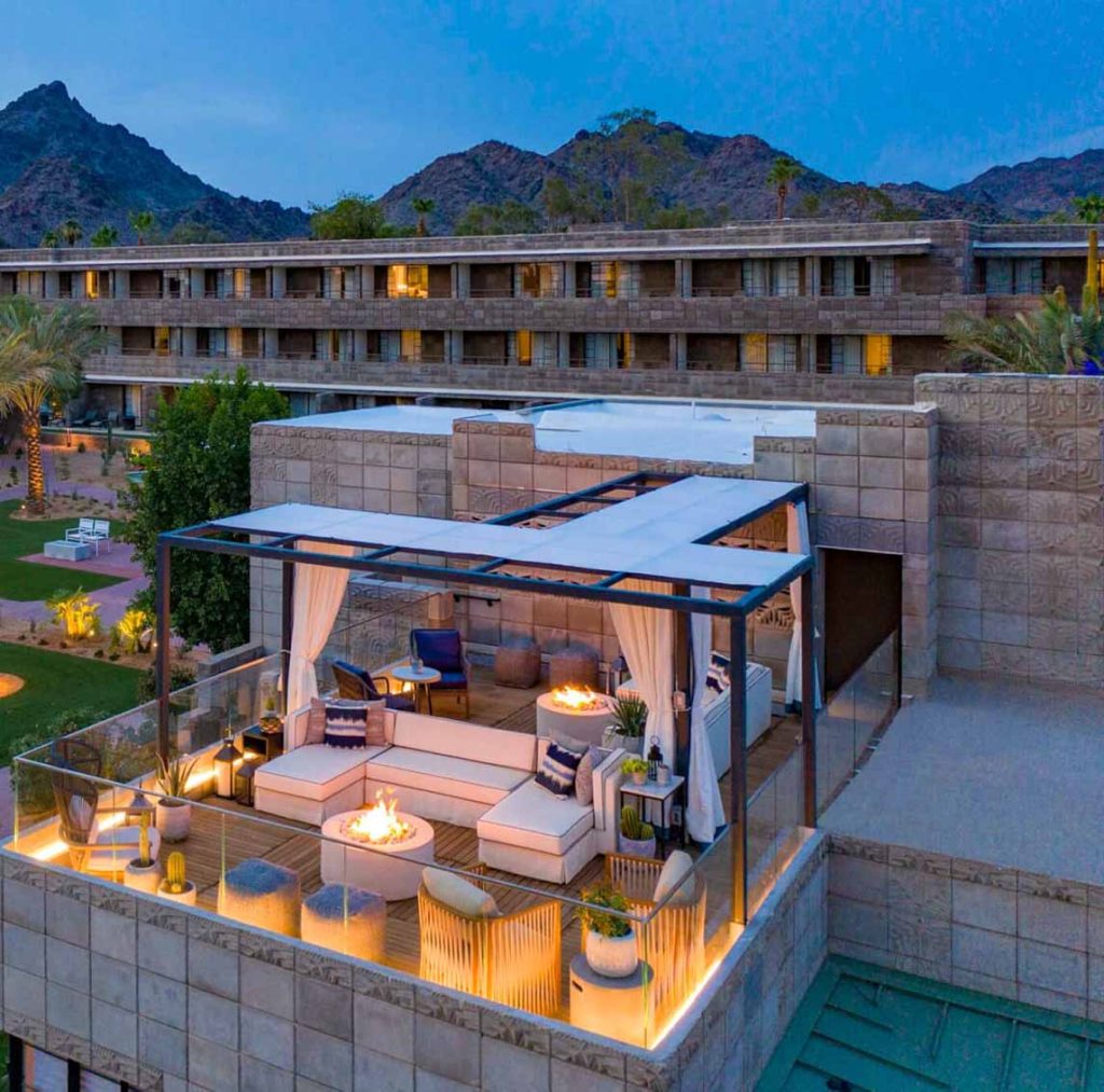 The resort features seven distinct pools, the most famous being the Catalina Pool, lined with blue tiles designed by Wright himself—rumor has it Marilyn Monroe loved sunbathing here. The modern Saguaro Pool features a swim-up bar and private cabanas, ideal for groups or romantic getaways.